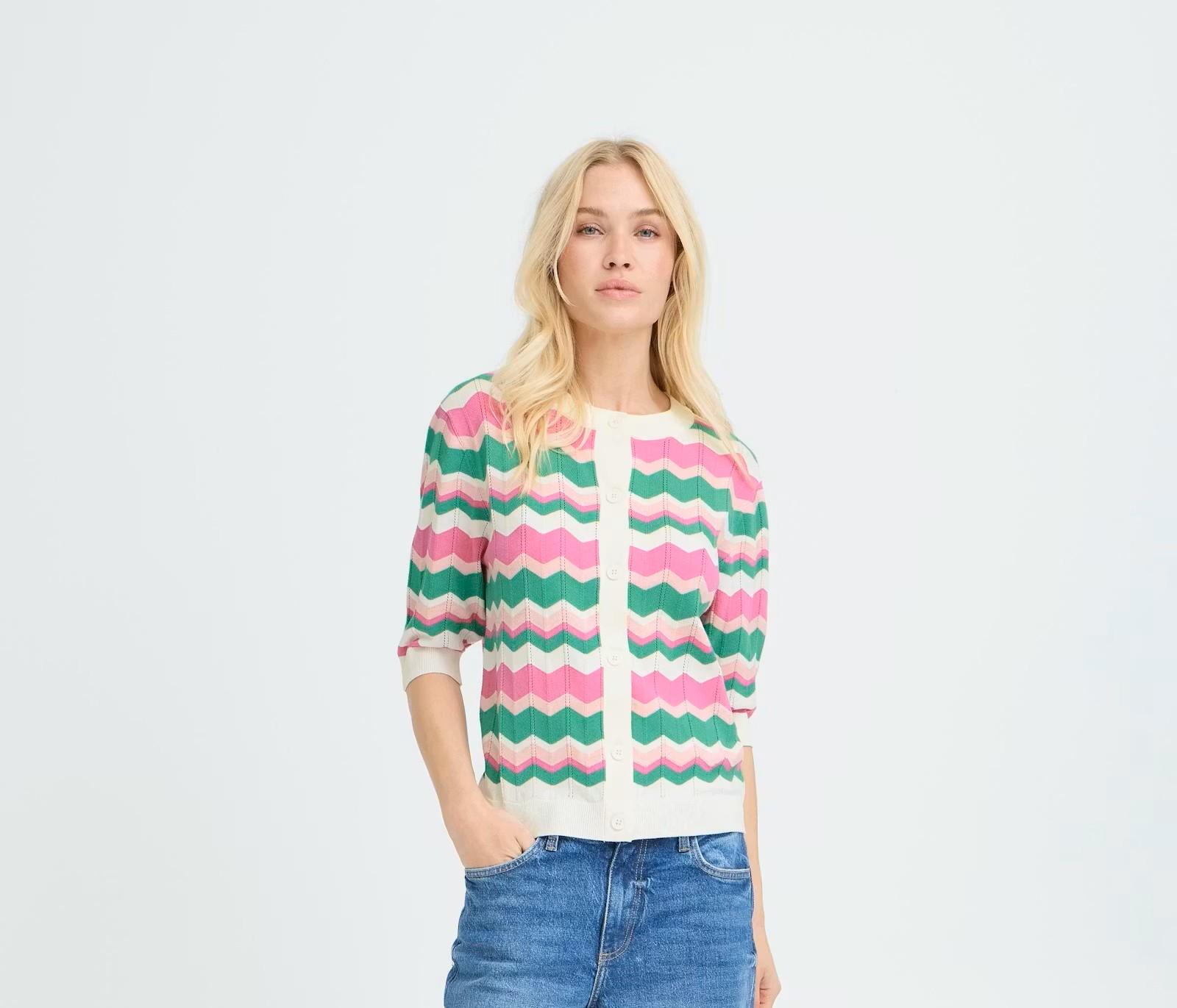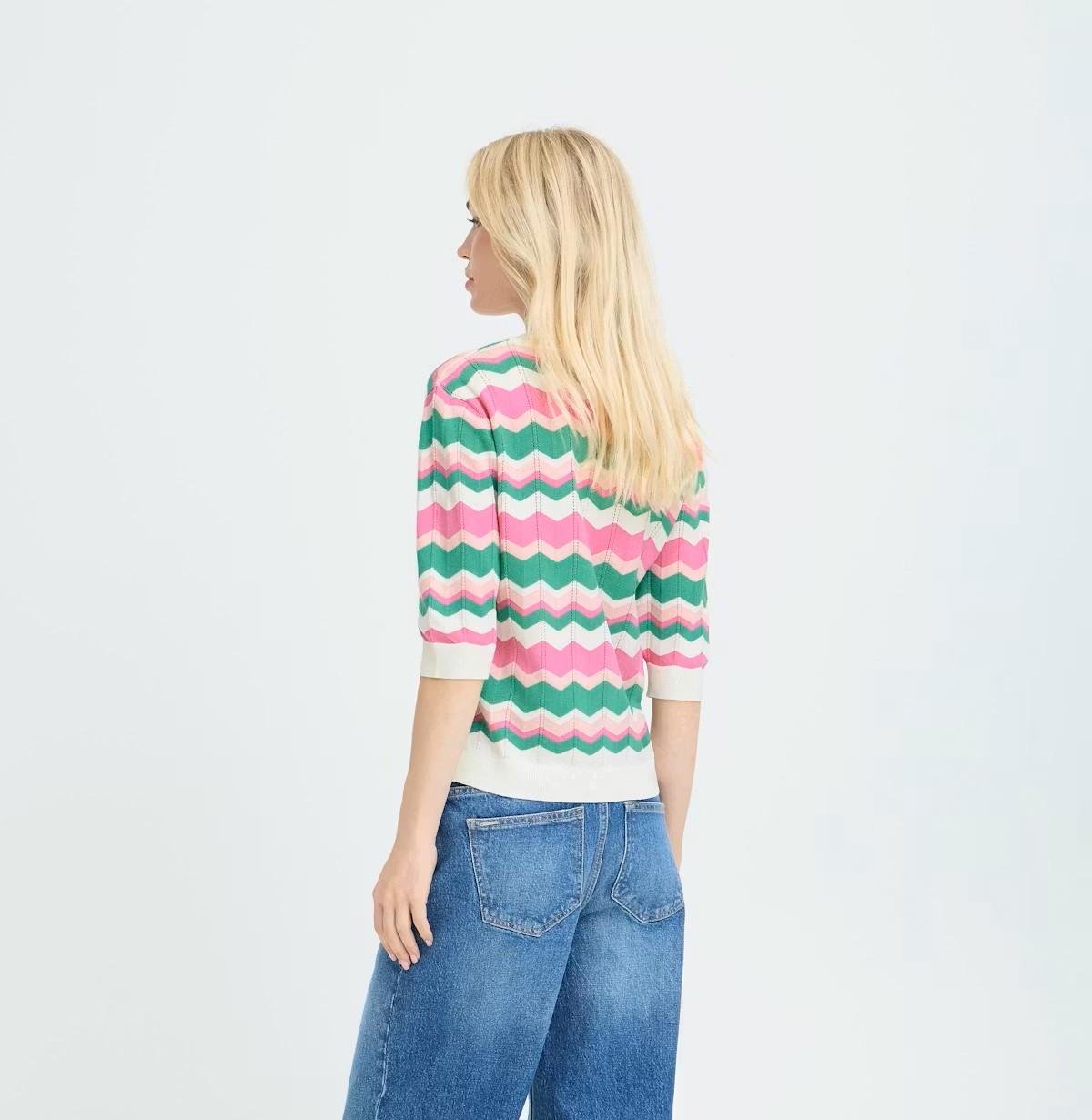 Cardigan à manches courtes, coupe droite avec un décolleté rond et une fermeture à boutons à l’avant . Le tricot a une texture subtile et aérienne. Des côtes sont présentes aux poignets, à l’ourlet et à l’encolure, contribuant à sa silhouette structurée.