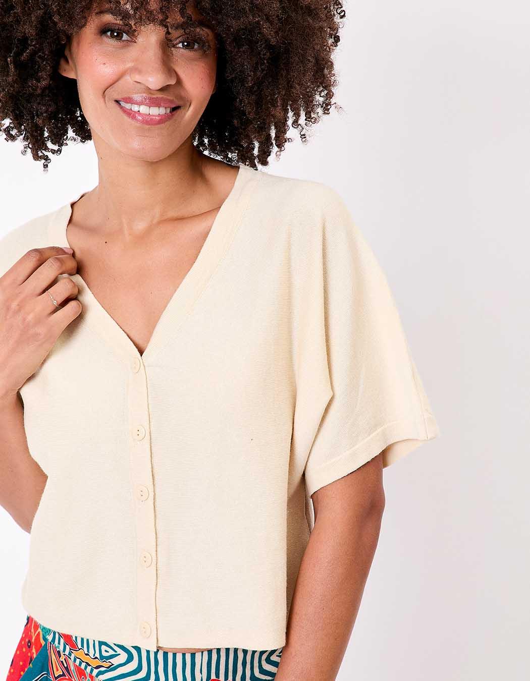 Gilet court à manches courtes féminin en maille ultra confortable en ramie et coton, qui peut se porter comme un petit top à même la peau, en gilet sur une robe ou avec un pantalon taille haute.