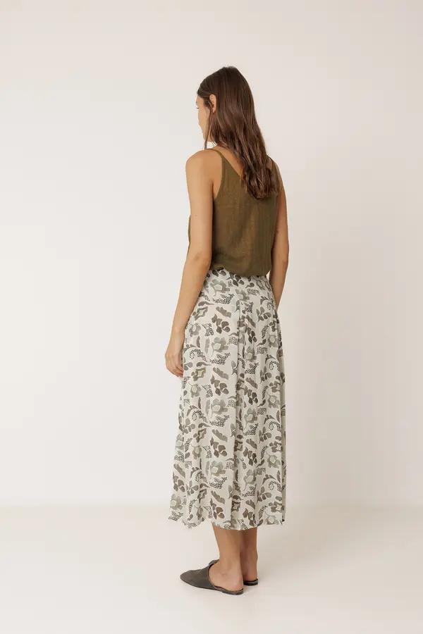 Jupe midi de viscose est la pièce parfaite pour créer un look confortable et décontracté. Elle possède une taille avec une fermeture éclair, et des fronces apportant du mouvement à la jupe. Une jupe polyvalente et respectueuse de la planète!