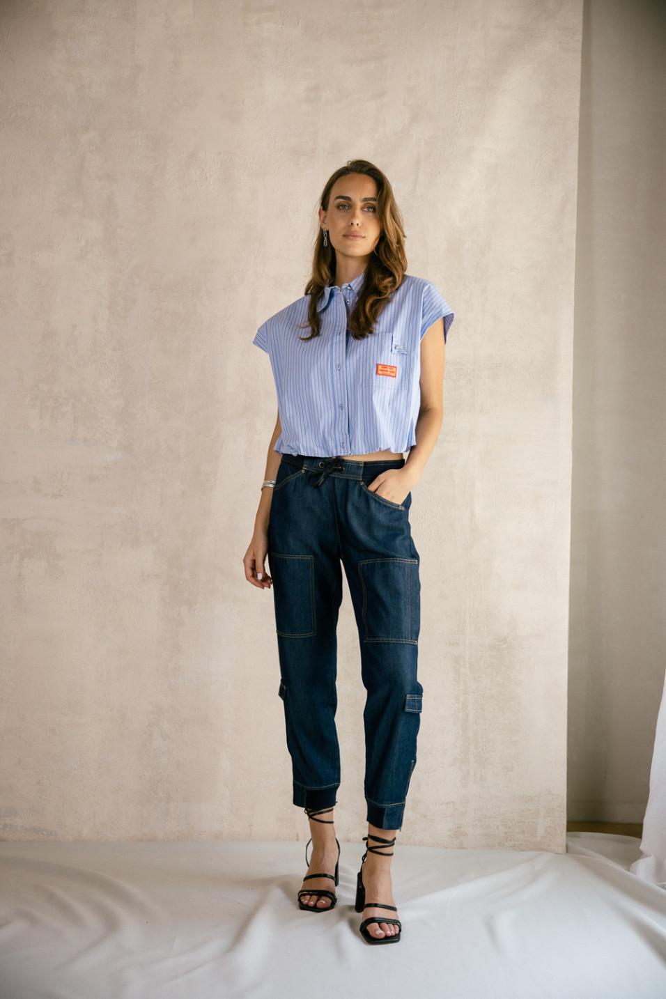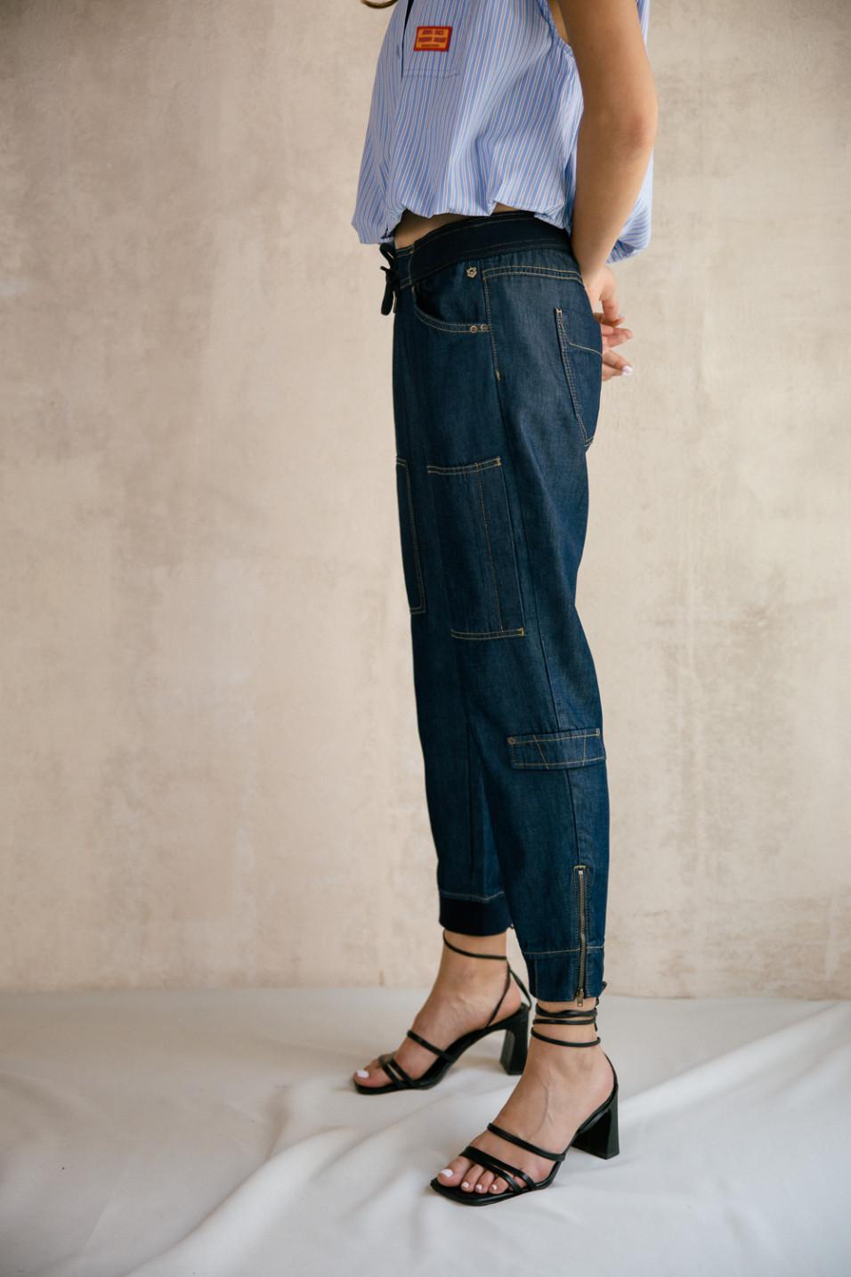 • Ceinture élastiquée avec cordon à nouer Poches sur cuisses Rabat de poches sur mollet Bas de jambe élastiqué avec zip
