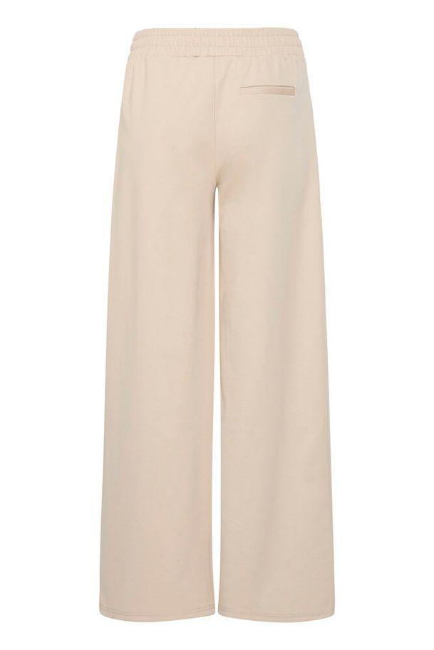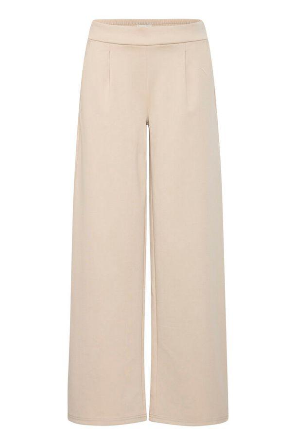 Pantalon large à taille haute élastique, plis discrets devant. Coupe droite et longueur classique.