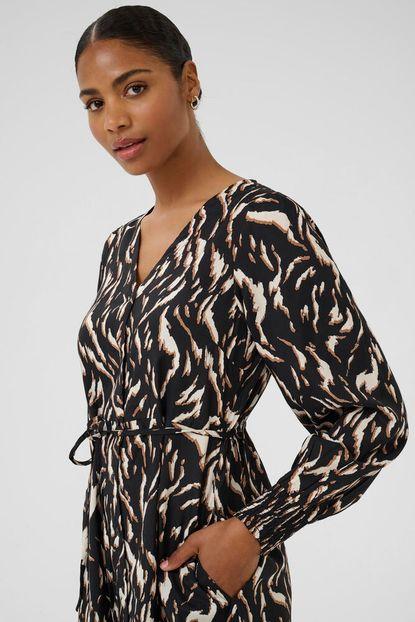 Robe col V et boutonnée tout du long. Elastiquée au niveau du dos. Longeur midi.
